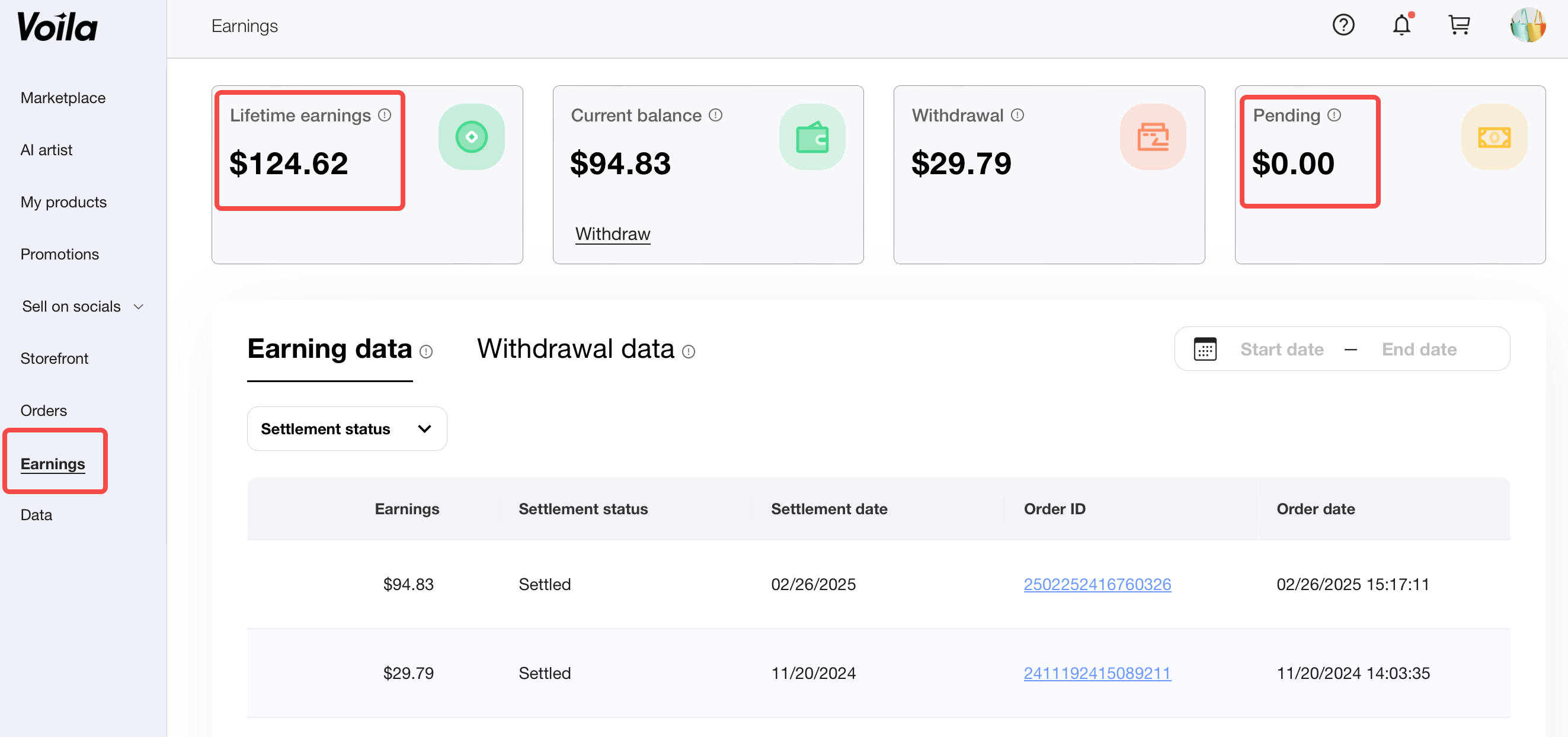 *In Lifetime Earnings, you can view your total earnings, while Pending shows payment from orders that have not yet been delivered.