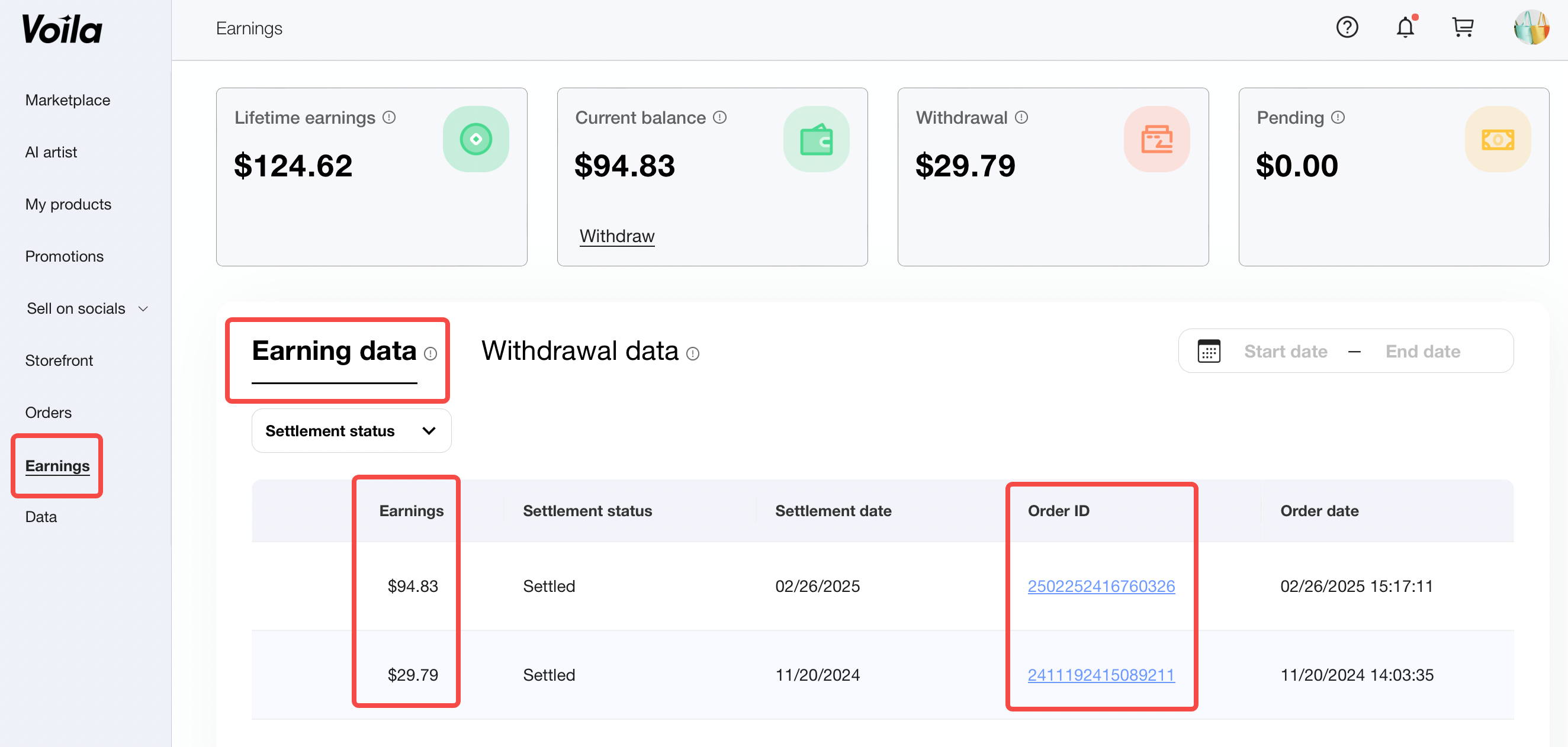 2. In Earning Data under the Earnings tab , you can see the earnings generated from each individual order.