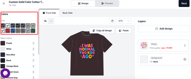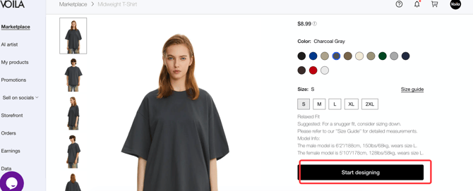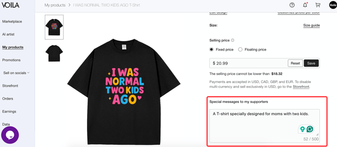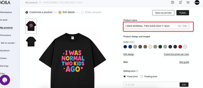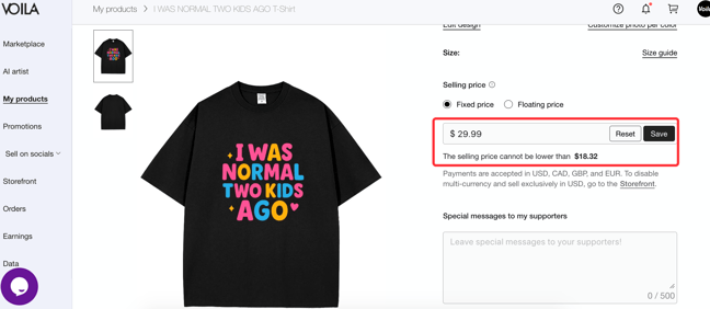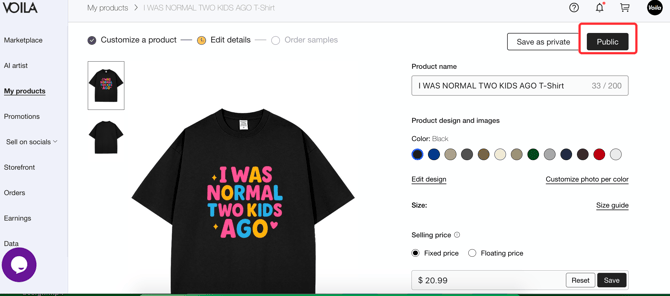 You can set a single fixed price or vary the price based on color by clicking Floating Price. Even with the default pricing, you’ll make a profit.