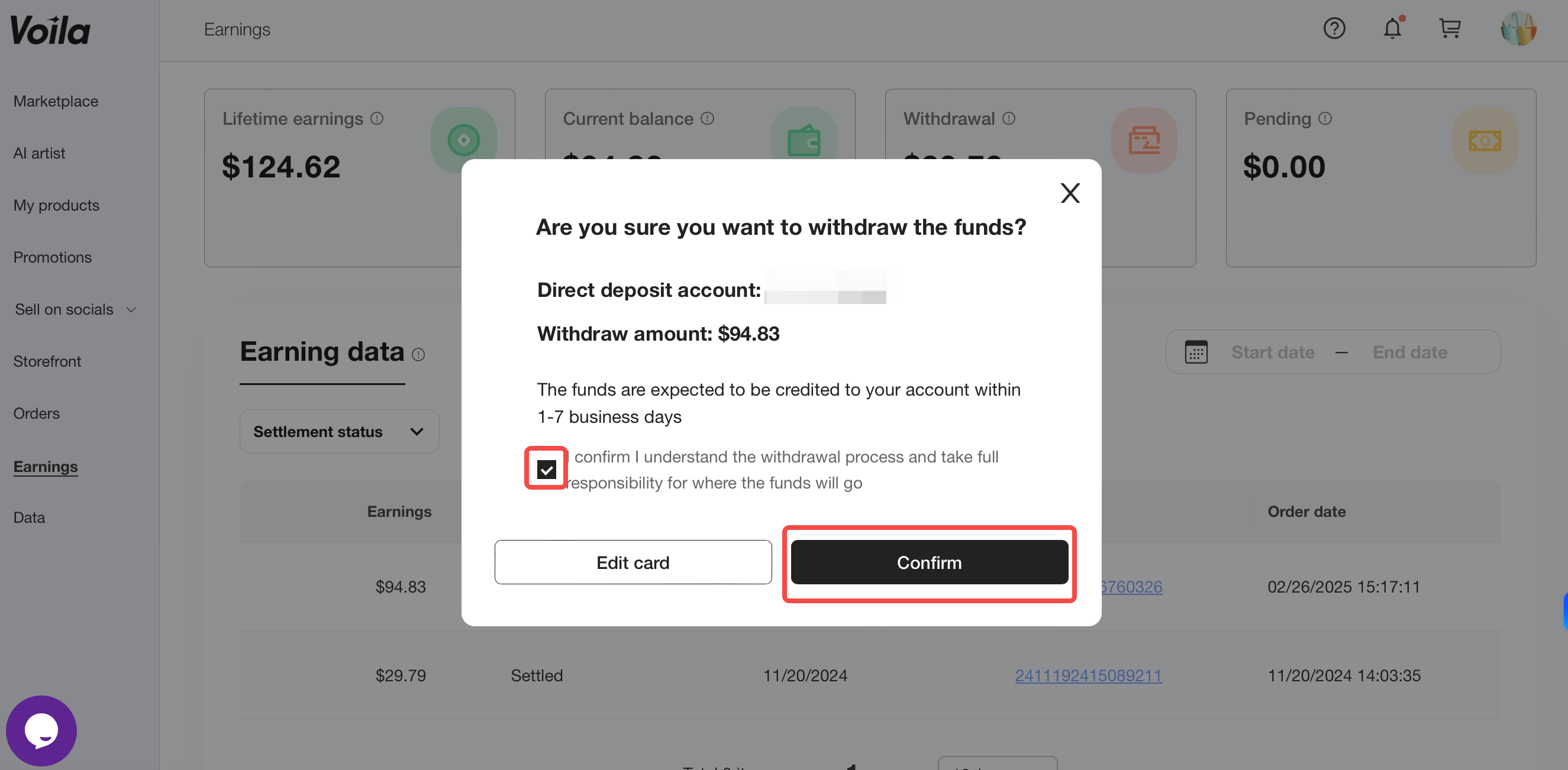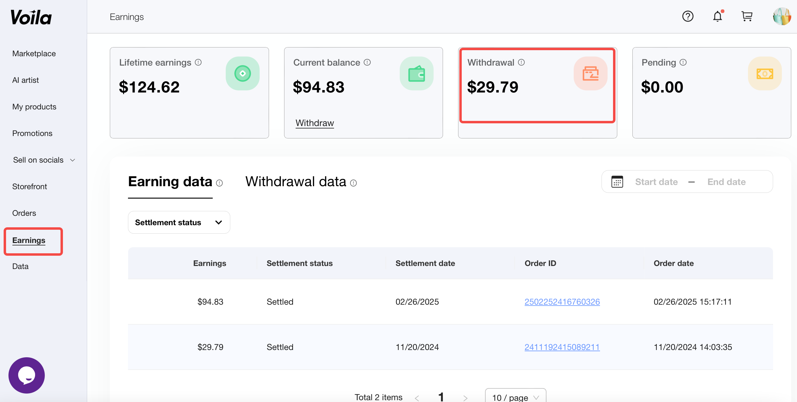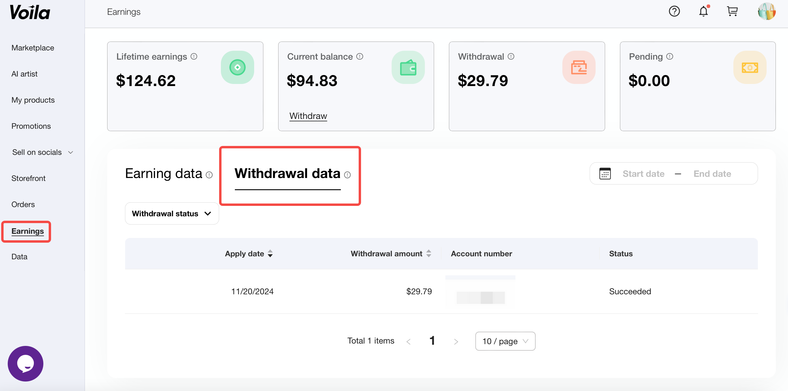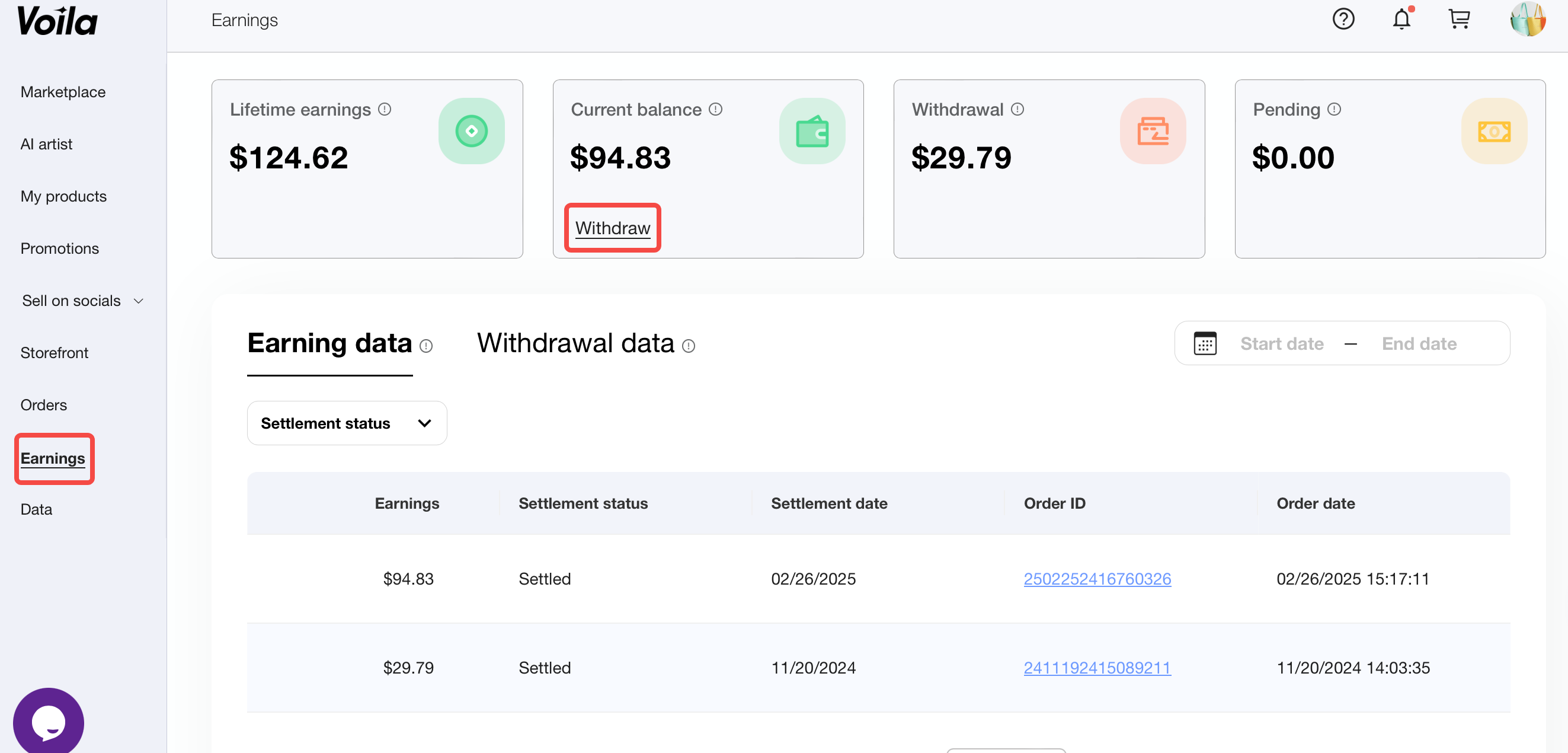 2.1 When the status of a user order changes to Completed, the corresponding Earnings status will also change from Pending to Withdrawal. You can view the specific amount in the Current balance section.