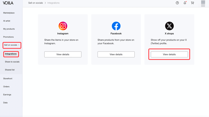 1.1 Click on Sell on social -Integrations in the left menu, then click on X shops.
